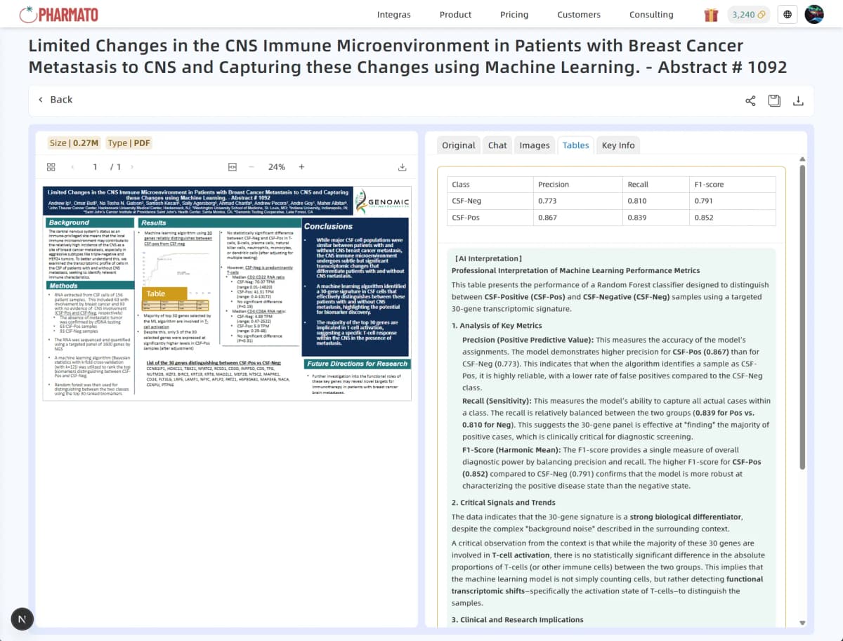 For complex poster content and diverse layouts, Pharmato Poster Lens automatically identifies page structures while preserving parsing order. It accurately segments and extracts titles, text, images, and tables, and intelligently captures key information such as drug, indication, development stage, key metrics, study objective, and conclusion.