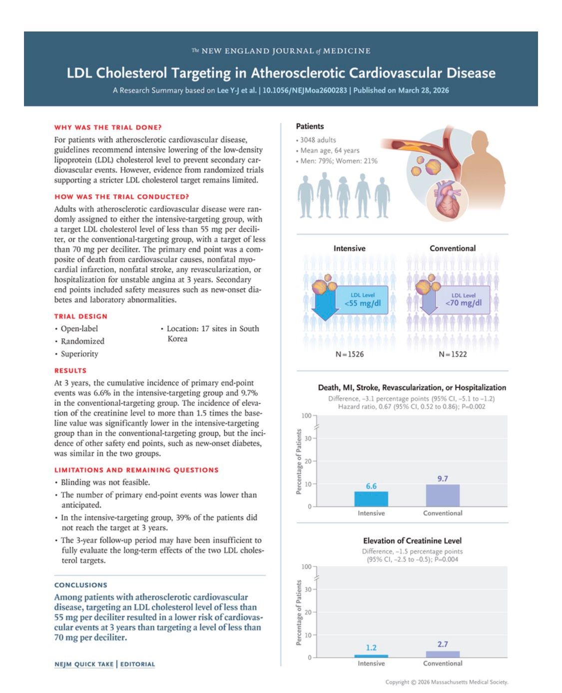 Excellent Safety Profile: There were no significant differences between the two groups regarding prespecified safety endpoints (e.g., new-onset diabetes, muscle symptoms, or elevated transaminases). Notably, the incidence of elevated creatinine was actually lower in the intensive-target group (1.2% vs. 2.7%; P=0.004).